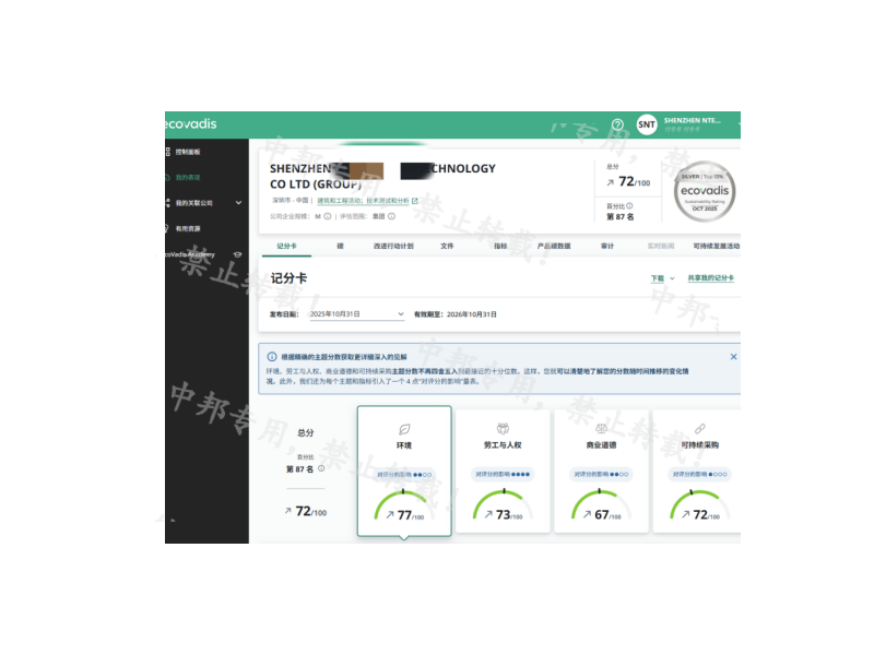 恭贺深圳市XX检测技术有限公司2025年10月EcoVadis取得72分的优秀成绩